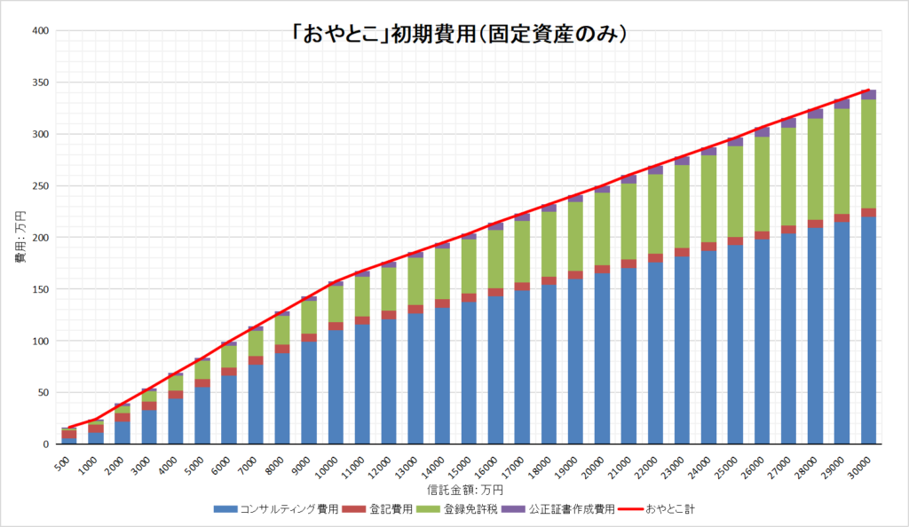 | コンサルティング費用 | 信託財産評価額が3,000万円以下の場合は330,000円に固定、3,000万円~1億円で1.1%、1億円超〜3億円で0.55% | |